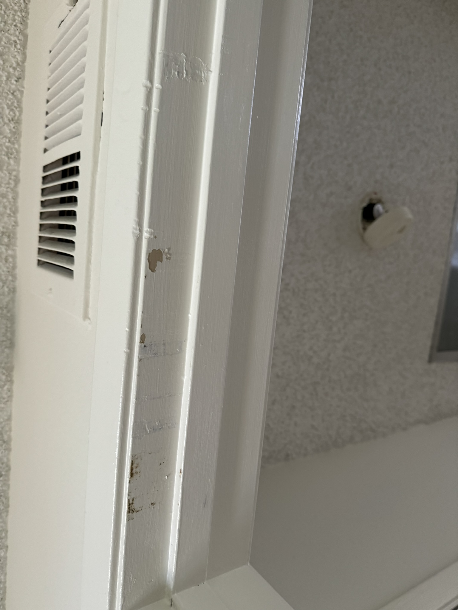 Front door jam dry rot. Front door jam moldy. Front door a fire hazard as you can get stuck inside and unable to open. I put blue painters tape over the turn lock as to remind not to lock or peril, since move in.